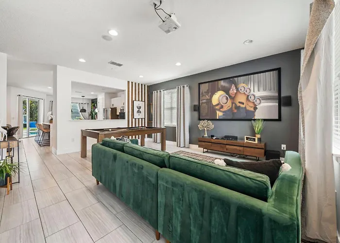 Cozinha totalmente equipada, juntamente com zona de refeições, estão disponíveis para refeições. Os hóspedes também podem usar refrigerador, forno e utensílios de cozinha para preparar a sua própria refeição. Os hóspedes também podem chegar à Contemporary 6 Bdrm Home With Private Spa In Encore de carro do aeroporto em Orlando Internacional em 36 minutos.
